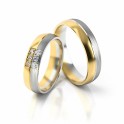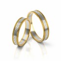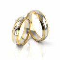 Obrączki płaskie zbudowane z dwóch pierścieni złota w kolorze białym i żółtym.Przez środek modelu przebiega frezowana linia , która oddziela kolory.Szerokość 4 mm.Waga 8,4-8,9g.