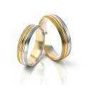 Obraczki płaskie dwukolorowe.Środkowy pierścień z białego złota otoczony jest z dwóch stron wąskimi pasami złota w kolorze żółtym.Model ozdobiony dwoma frezowanymi rowkami.Szerokość 4 mm.Waga 5,7-6,3g.
