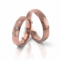 Obrączki wypukłe w całości wykonane z żółtego złota.W całości satynowa powierzchnia modelu została ozdobiona falistymi wycięciami w których w wersji damskiej umieszczono cyrkonie.Szerokość 5 mm.Waga 8,8g.-9,3 g.