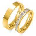 Obrączki o polerowanej płaskiej powierzchni wykonane z żółtego złota. Wersja damska może być ozdobiona niesymetrycznie umiecszczonymi cyrkoniami które robią wrażenie rozsypanych. Szerokość 5 mm. Waga 8,2 g.-8,8 g.