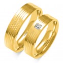 Obrączki wykonane w całości z żółtego złota. Płaską satynowaną powierzchnię modelu ozdabiają frezowane rowki biegnące symetrycznie wzdłuż obu brzegów modelu.W wersji damskiej obraczka może zostać wzbogacona centralnie umieszczoną cyrkonią. Szerokość 6 mm . Waga 9,0g.-9,6 g.