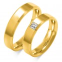 Obrączki płaskie , w całości wykonane z żółtego , polerowanego złota. W wersji damskiej możliwość zakucia kamyczka w prostokątnej oprawie. Po obydwu stronach kamienia wąskie wcięcia na obrączce. Szerokość 5mm. Waga 19,50g.