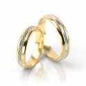 Obrączki wykonane z trzech pierścieni.Dwa zewnętrzne to złoto żółte polerowane które rozdziela biały pas ozdobiony gestym wzorem.Szerokość 4,3 mm.Waga 7,1-7,7g.