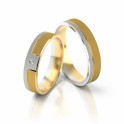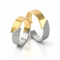 Obrączki dwukolorowe o wypukłym profilu.Jedna połowa modelu to złoto żółte o polerowanej powierzchni ,a druga została wykonana z mocno satynowego złota w kolorze białym.Łączenie kolorów przebiega w kształcie fali i podkreślone jest frezowanym błyszczącym rowkiem.Szerokość 5 mm.Waga 8,9-9,6g.