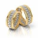 Obrączki o gładkich polerowanych brzegach.Przez środek modelu przebiega szeroki warkocz z białego złota oddzielony od brzegów wąskim sznureczkiem w kolorze żółtym.Szerokość 8 -9 mm.Waga 15,1-15,8g.