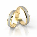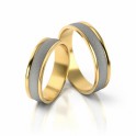 Obrączki dwukolorowe wypukłe.Mocno satynowana biała powierzchnia kontrastuje z polerowanymi żółtymi taflowanymi brzegami modelu.Szerokość 4,5 mm.Waga 8,1-8,5g.