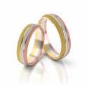 Obrączki wykonane z trzech pierścieni-żółtego białego oraz czerwonego.Kolory oddzielają frezowane błyszczącerowki które kontrastują z satynową powierzchnią modelu.Szerokośc 5 mm.Waga 9,2-9,8g.