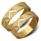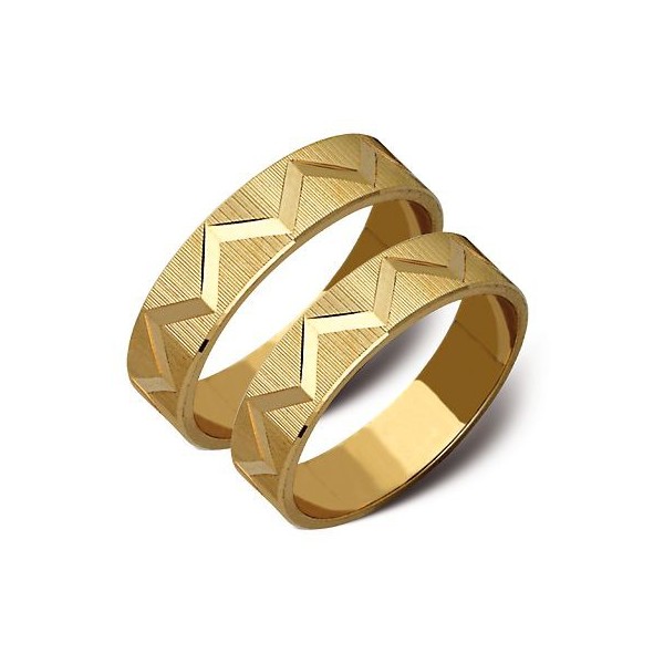 Obrączki ślubne płaskie wykonane z żółtego matowionego złota z błyszczącym grawerem.